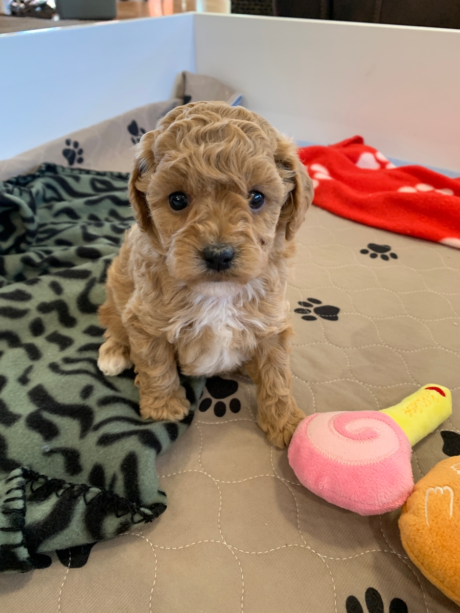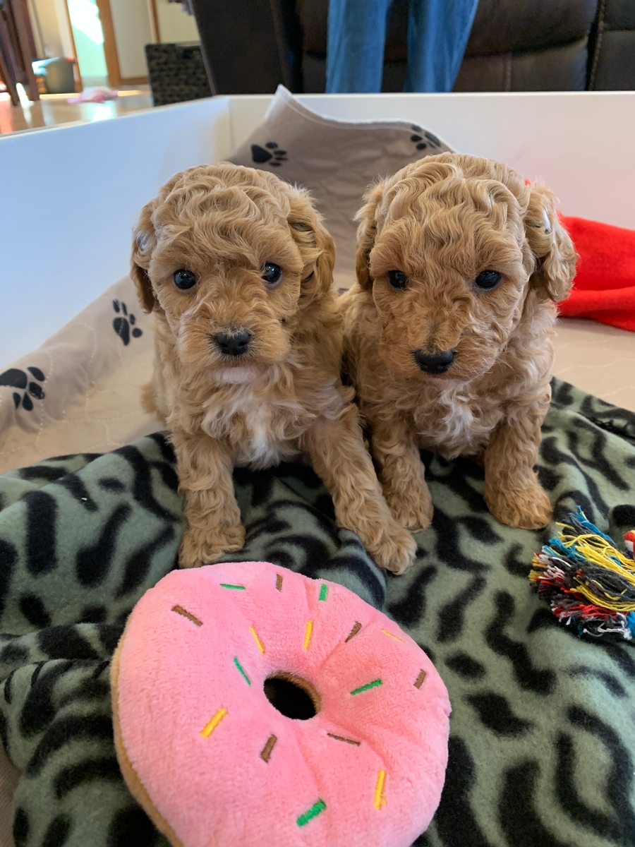 Cooper is a spunky little boy full of love and life! He loves to chase his siblings but then also likes to snuggle up and charm us all. He is a beautiful intense red teddy bear micro mini Goldendoodle. He is non shedding and will grow to be around 12-18 lbs full size. He currently weighs 2.07 lbs. He will come up to date on all vaccinationsu and dewormings and will be cleared by our vet before leaving. He also comes with a puppy starter pack and will have a folder with all his records in it. He will be ready by May 29th.