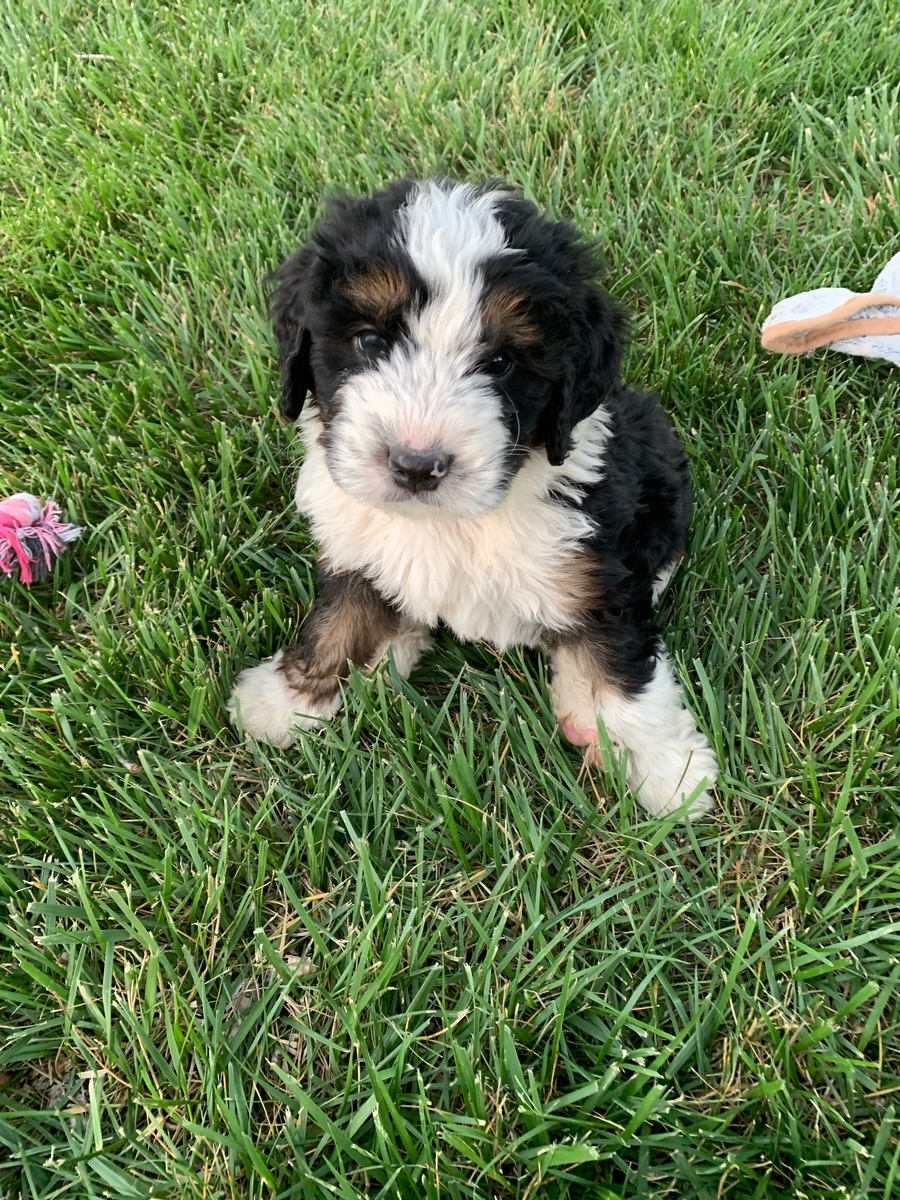 Ripley is more of a quiet and reserved little boy. He loves to give kisses and play with his squeak toys too! He is a F1 Medium Bernedoodle and will have minimal shedding and will grow to be around 40-70 lbs full size. He weighs 7 lbs 1 oz and will be ready by Feb 6th. He will come up to date on all vaccinations and dewormings, microchipped, and health/vet checked and cleared before leaving. Familes pick in the order of deposits received and selections will be made on the weekend of January 12-13th. Contact us today at 620-899-3173 to get your spot in line!
