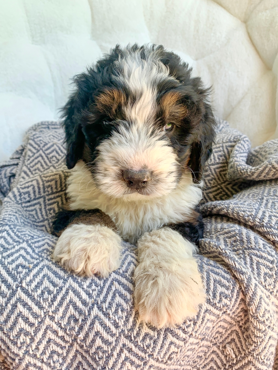 Camo is such an irresistibly cute little guy, and is sure to steal your heart! He is an F1 Medium Bernedoodle, and will have minimal shedding. He is weighing 7 lbs 1 oz currently and will grow to be around 35-55 lbs as a full sized adult. He will be ready to go to his new home by May 18th but we can hold for a week or two longer if needed with your schedule. He will come up to date on all vaccinations and has had all his regular dewormings. Camo has an introduction to crate/potty training so he has a head start for you! He will also be microchipped, and have a health/vet check and will be cleared before leaving. We welcome home visits or FaceTime calls if you would like to meet him.
