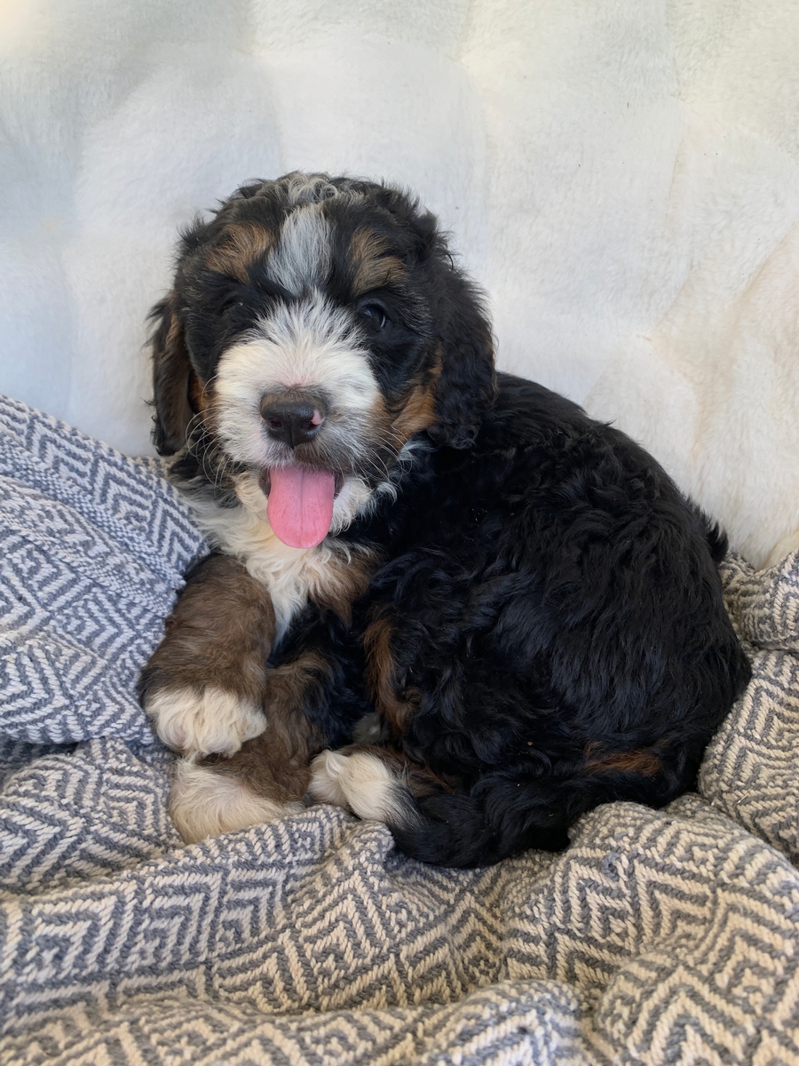Camo is such an irresistibly cute little guy, and is sure to steal your heart! He is an F1 Medium Bernedoodle, and will have minimal shedding. He is weighing 7 lbs 1 oz currently and will grow to be around 35-55 lbs as a full sized adult. He will be ready to go to his new home by May 18th but we can hold for a week or two longer if needed with your schedule. He will come up to date on all vaccinations and has had all his regular dewormings. Camo has an introduction to crate/potty training so he has a head start for you! He will also be microchipped, and have a health/vet check and will be cleared before leaving. We welcome home visits or FaceTime calls if you would like to meet him.