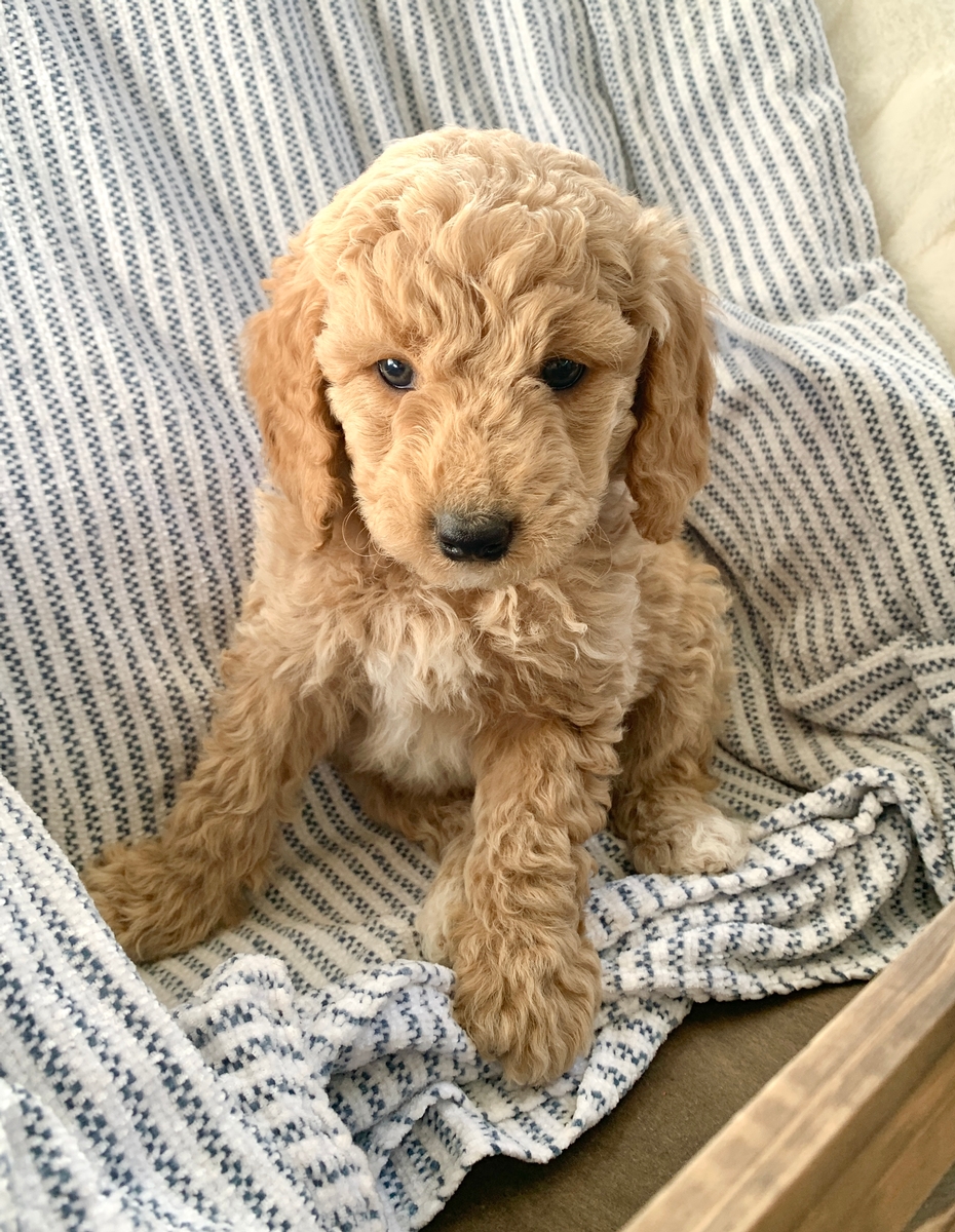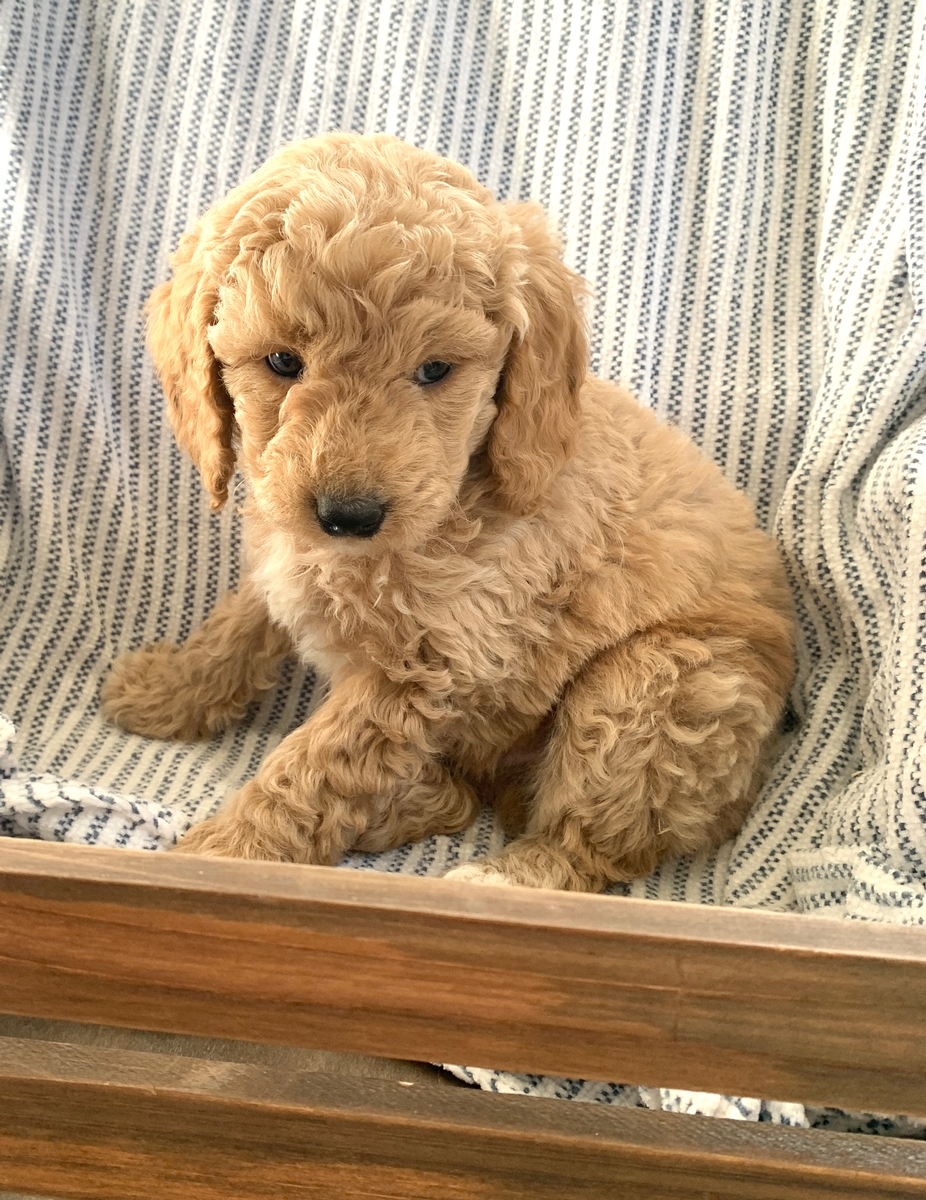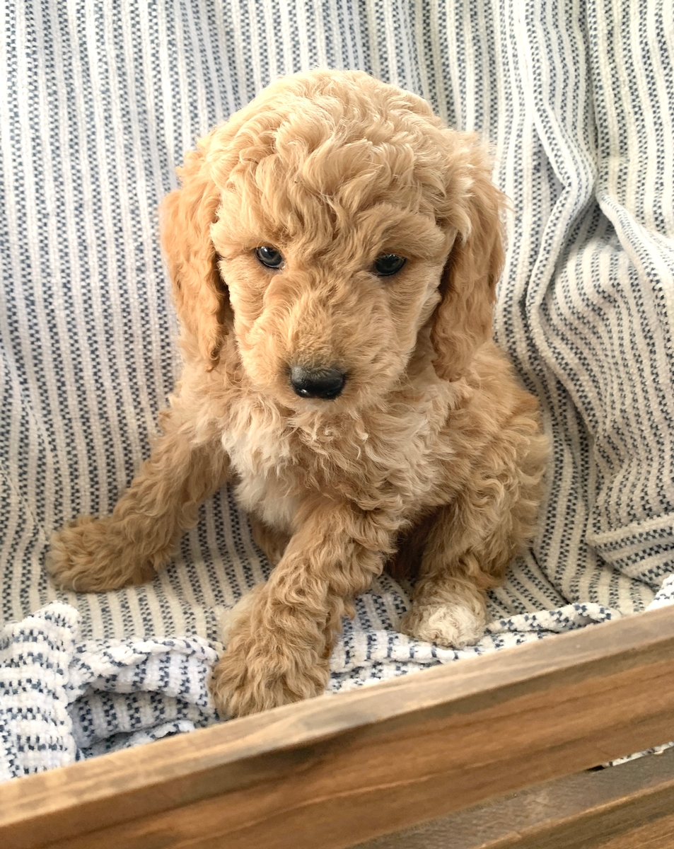 Dallas is a F1bb mini Goldendoodle and weighs 6 lbs 12 oz. He is so sweet and calmer and loves all the snuggles he can get! He is non shedding and will grow to be around 18-25 lbs full size. He is up to date on all vaccinations and dewormings, microchipped, and is health checked and cleared by our vet. He is also lovingly socialized by our family and has a head start on potty training! He will be 8 weeks old and ready to go by March 1st.