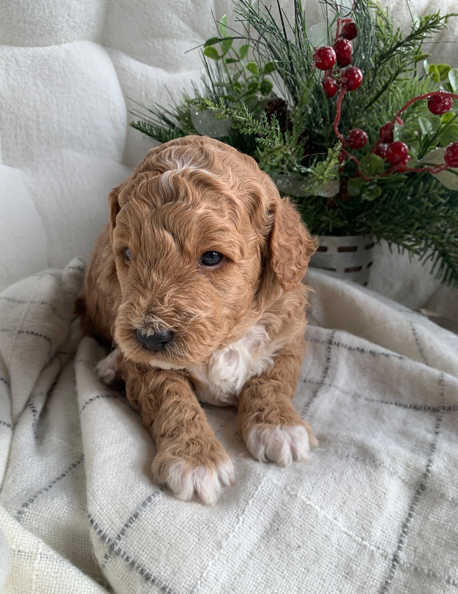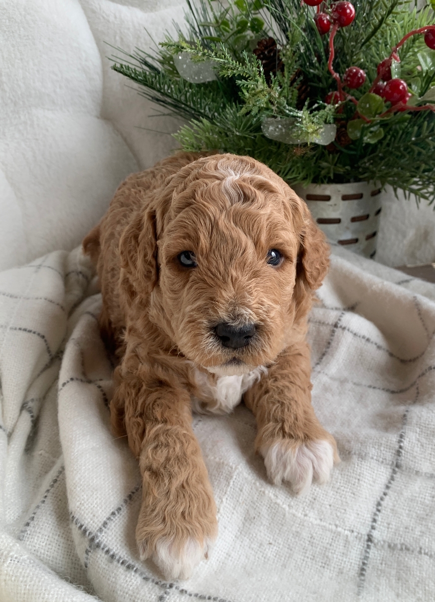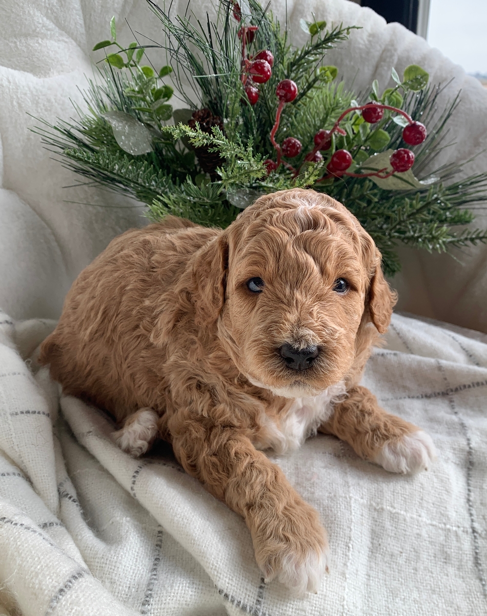 Heath is such a cute and loving little guy! He is a F1bb Mini Goldendoodle and he is weighing right at 3 lbs 9 oz now. He is non shedding/hypoallergenic and will grow to be around 18-30 lbs full size, probably closer to 30 lbs. He will be ready for his new home by January 24th. He is lovingly socialized by our children daily and will do great around people of all ages, young and old! These puppies will also be up to date on all vaccinations and dewormings, microchipped upon request, and health/vet checked and cleared before leaving. All of our puppies go to their new homes with a puppy starter pack as well, including a collar, leash, chew toy, a 5 lb bag of puppy food, and a folder with all their health records and information. We do welcome home visits and/or FaceTime calls if you would like to meet Heath. Please call or text Marlene at 620-899-3173 if you are interested in reserving one of these cuties for your family!