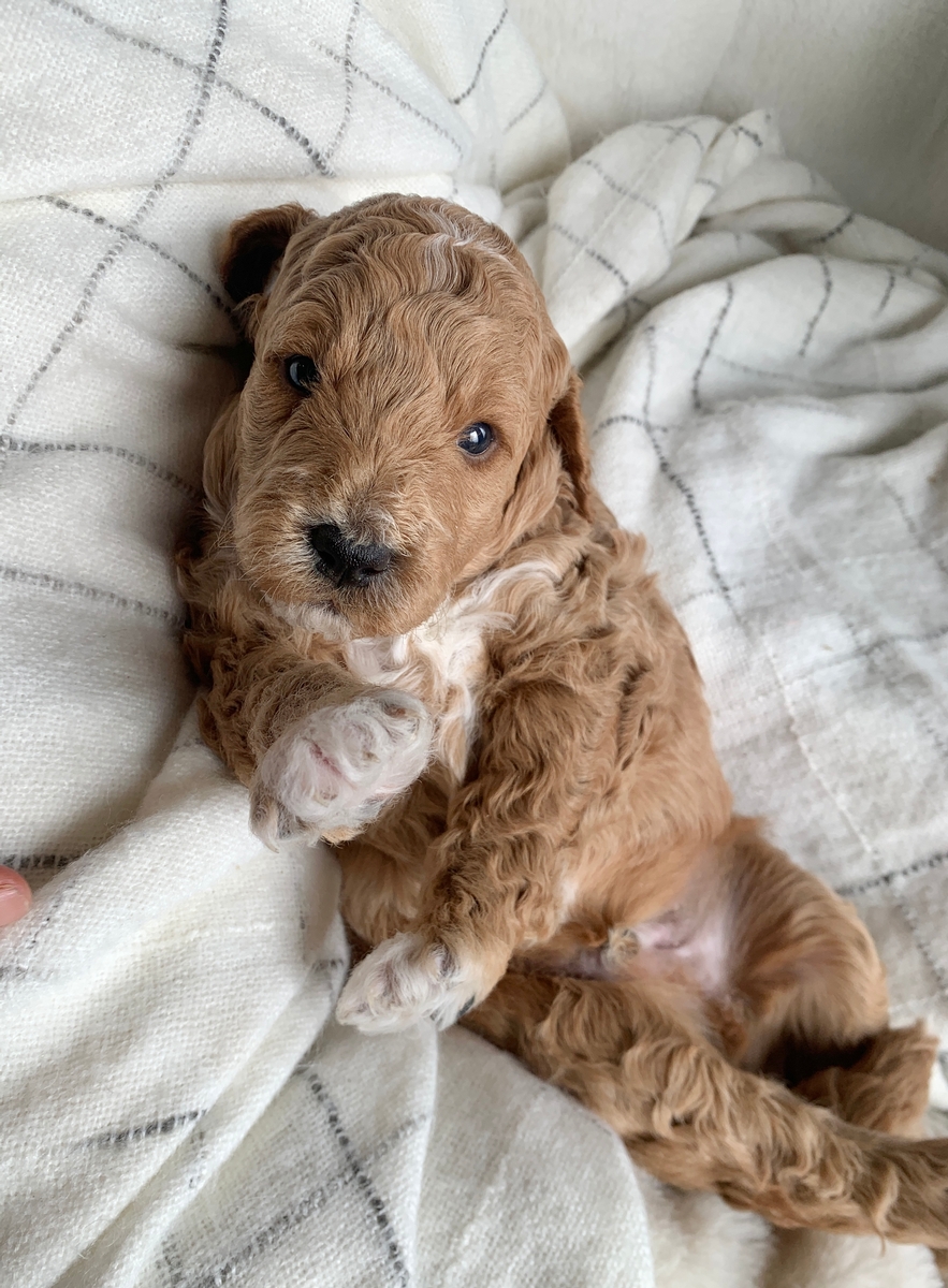 Honey is such a cute and loving little girl! She is a F1bb Mini Goldendoodle and she is weighing right at 3 lbs 4 oz now. She is non shedding/hypoallergenic and will grow to be around 18-30 lbs full size, probably closer to 30 lbs. She will be ready for his new home by January 24th. She is lovingly socialized by our children daily and will do great around people of all ages, young and old! These puppies will also be up to date on all vaccinations and dewormings, microchipped upon request, and health/vet checked and cleared before leaving. All of our puppies go to their new homes with a puppy starter pack as well, including a collar, leash, chew toy, a 5 lb bag of puppy food, and a folder with all their health records and information. We do welcome home visits and/or FaceTime calls if you would like to meet Honey. Please call or text Marlene at 620-899-3173 if you are interested in reserving one of these cuties for your family!