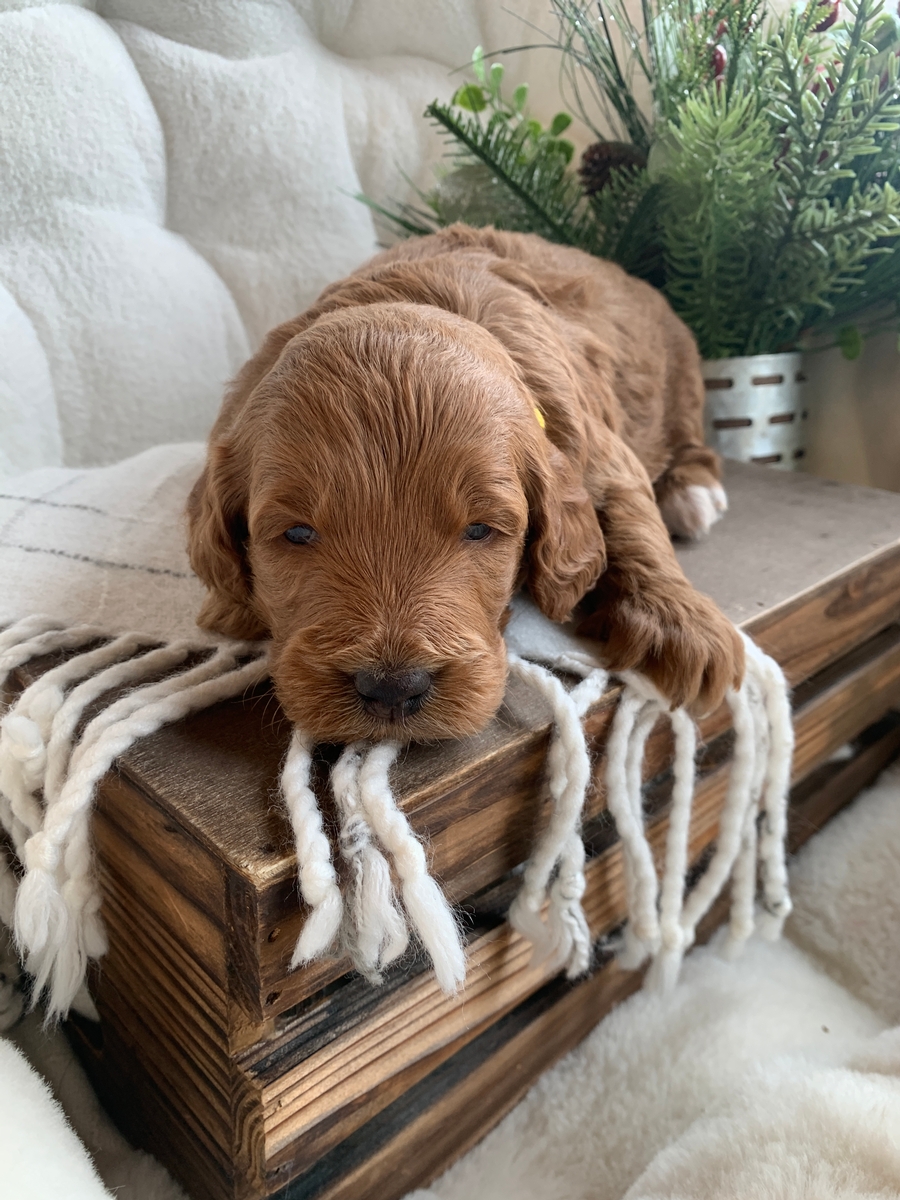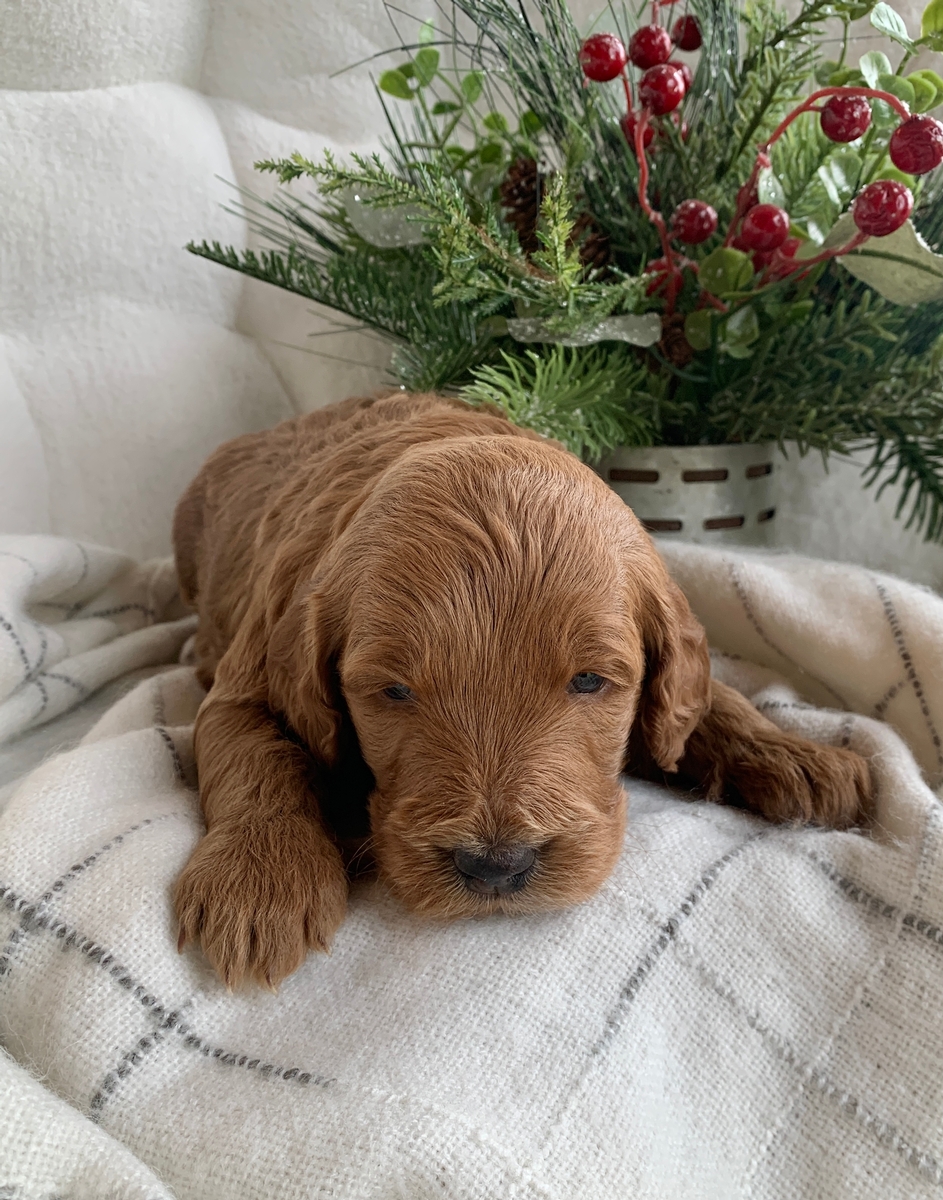Heath is such a cute and loving little guy! He is a F1bb Mini Goldendoodle and he is weighing right at 3 lbs 9 oz now. He is non shedding/hypoallergenic and will grow to be around 18-30 lbs full size, probably closer to 30 lbs. He will be ready for his new home by January 24th. He is lovingly socialized by our children daily and will do great around people of all ages, young and old! These puppies will also be up to date on all vaccinations and dewormings, microchipped upon request, and health/vet checked and cleared before leaving. All of our puppies go to their new homes with a puppy starter pack as well, including a collar, leash, chew toy, a 5 lb bag of puppy food, and a folder with all their health records and information. We do welcome home visits and/or FaceTime calls if you would like to meet Heath. Please call or text Marlene at 620-899-3173 if you are interested in reserving one of these cuties for your family!