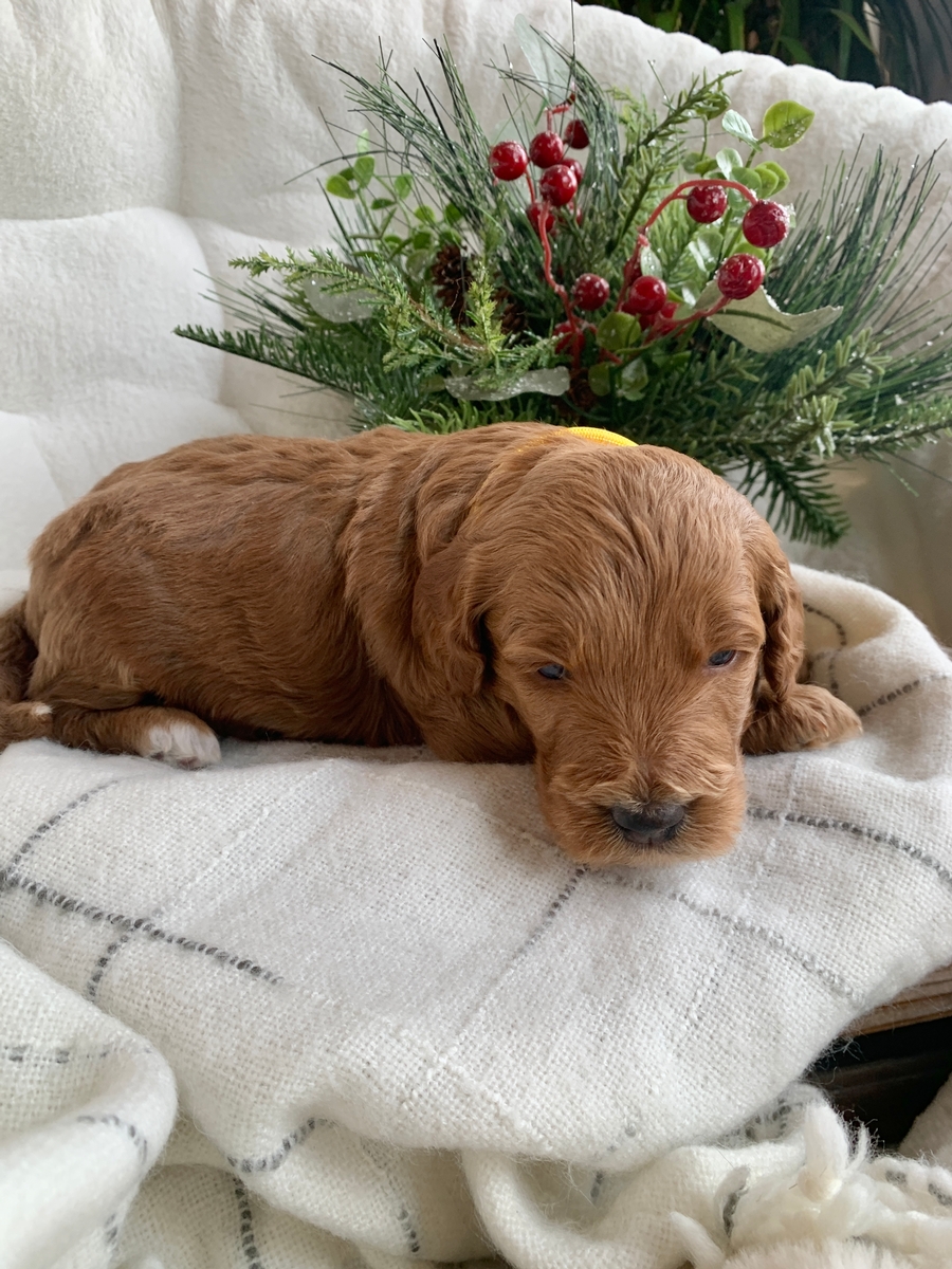Holly is such a cute and loving little girl! She is a F1bb Mini Goldendoodle and she is weighing right at 3 lbs 4 oz now. She is non shedding/hypoallergenic and will grow to be around 18-30 lbs full size, probably closer to 30 lbs. She will be ready for his new home by January 24th. She is lovingly socialized by our children daily and will do great around people of all ages, young and old! These puppies will also be up to date on all vaccinations and dewormings, microchipped upon request, and health/vet checked and cleared before leaving. All of our puppies go to their new homes with a puppy starter pack as well, including a collar, leash, chew toy, a 5 lb bag of puppy food, and a folder with all their health records and information. We do welcome home visits and/or FaceTime calls if you would like to meet Holly. Please call or text Marlene at 620-899-3173 if you are interested in reserving one of these cuties for your family!