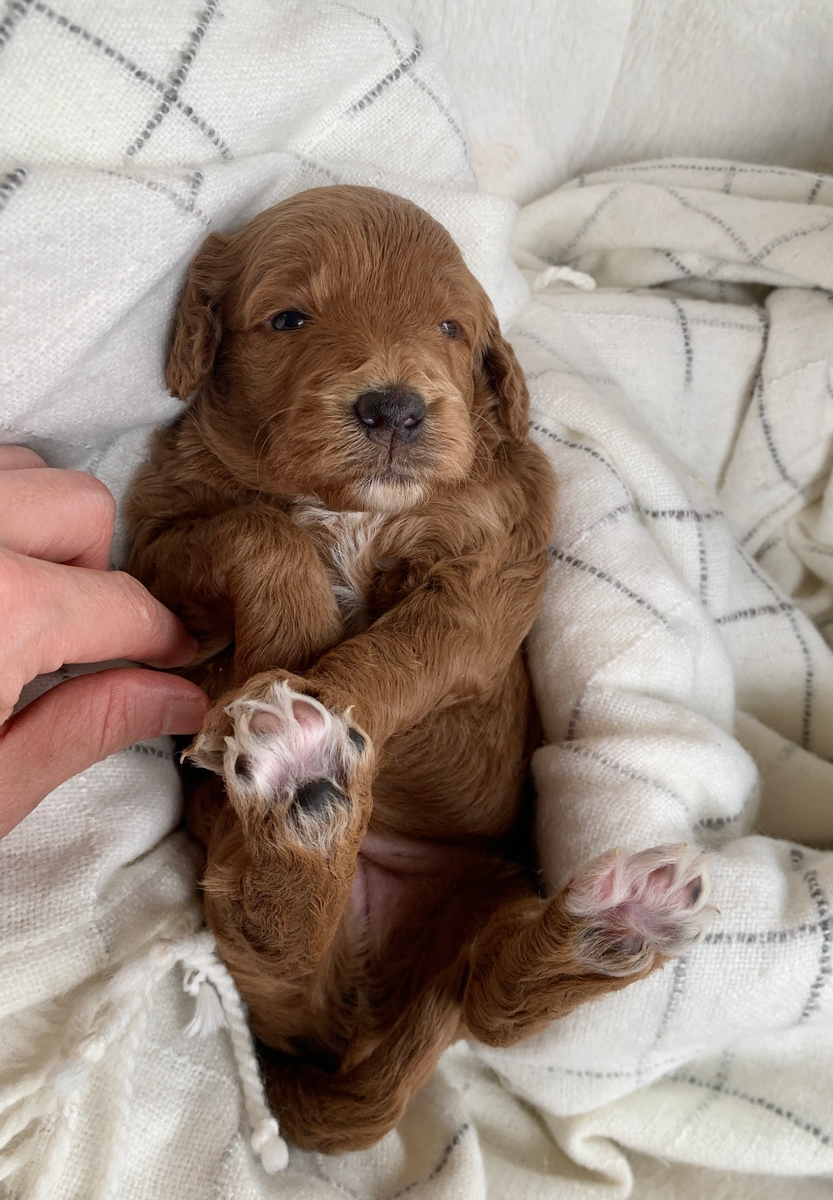 Honey is such a cute and loving little girl! She is a F1bb Mini Goldendoodle and she is weighing right at 3 lbs 4 oz now. She is non shedding/hypoallergenic and will grow to be around 18-30 lbs full size, probably closer to 30 lbs. She will be ready for his new home by January 24th. She is lovingly socialized by our children daily and will do great around people of all ages, young and old! These puppies will also be up to date on all vaccinations and dewormings, microchipped upon request, and health/vet checked and cleared before leaving. All of our puppies go to their new homes with a puppy starter pack as well, including a collar, leash, chew toy, a 5 lb bag of puppy food, and a folder with all their health records and information. We do welcome home visits and/or FaceTime calls if you would like to meet Honey. Please call or text Marlene at 620-899-3173 if you are interested in reserving one of these cuties for your family!