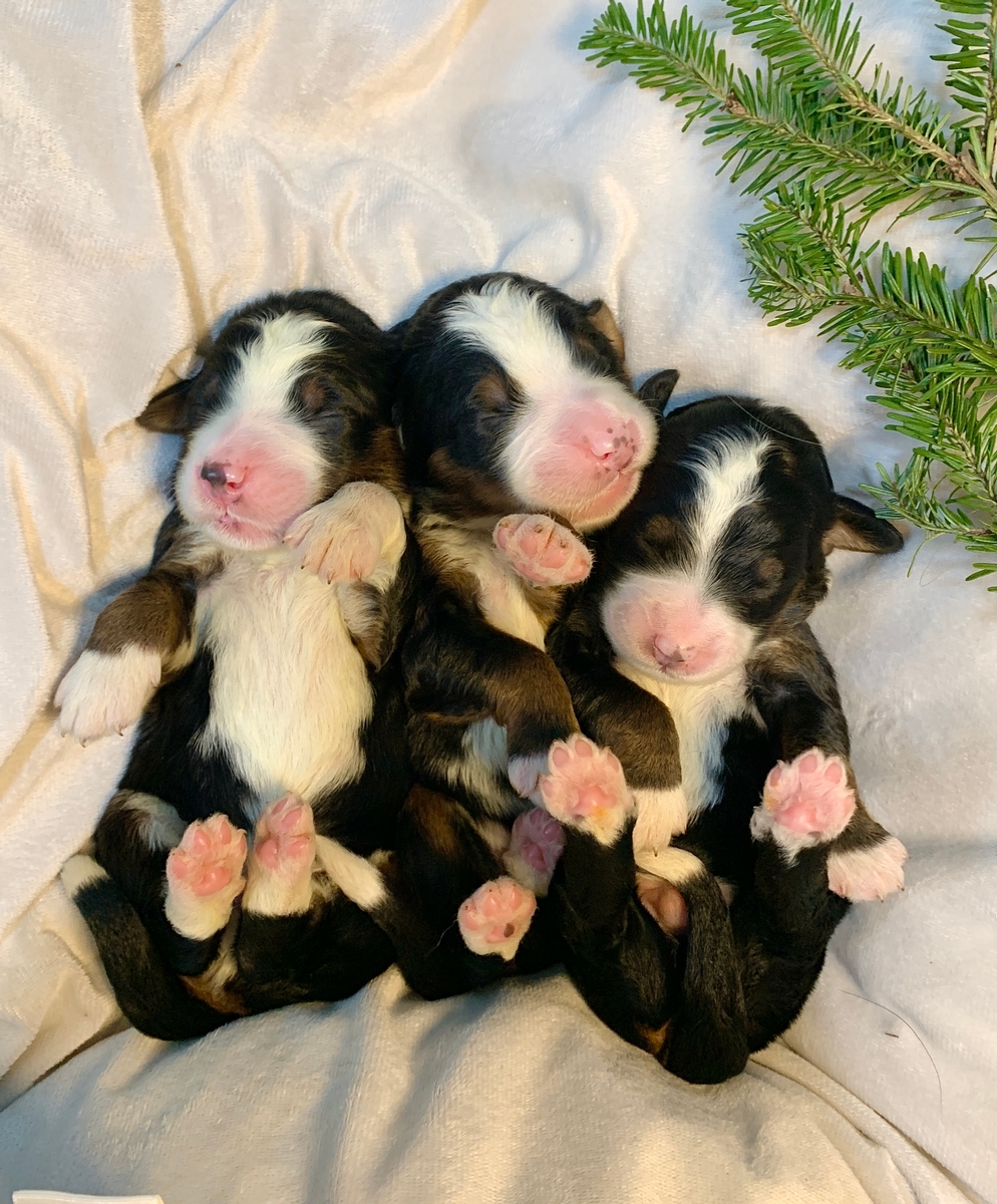 Angel and Prince’s F1 medium Bernedoodles are here! We have litter of 12 and they are all tri colored and are oh so sweet and snuggly! She had 9 boys and 3 girls. These will be minimal/non shedding puppies and will grow to be around 40-70 lbs full size, depending on the puppy. They will be up to date on all vaccinations and dewormings, microchipped, and vet/health checked and cleared before leaving. All the puppies will be lovingly socialized here in our home by our family. They will be ready to go by February 6th. Contact us today to get in line to pick your new fur baby today!