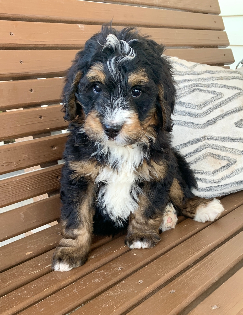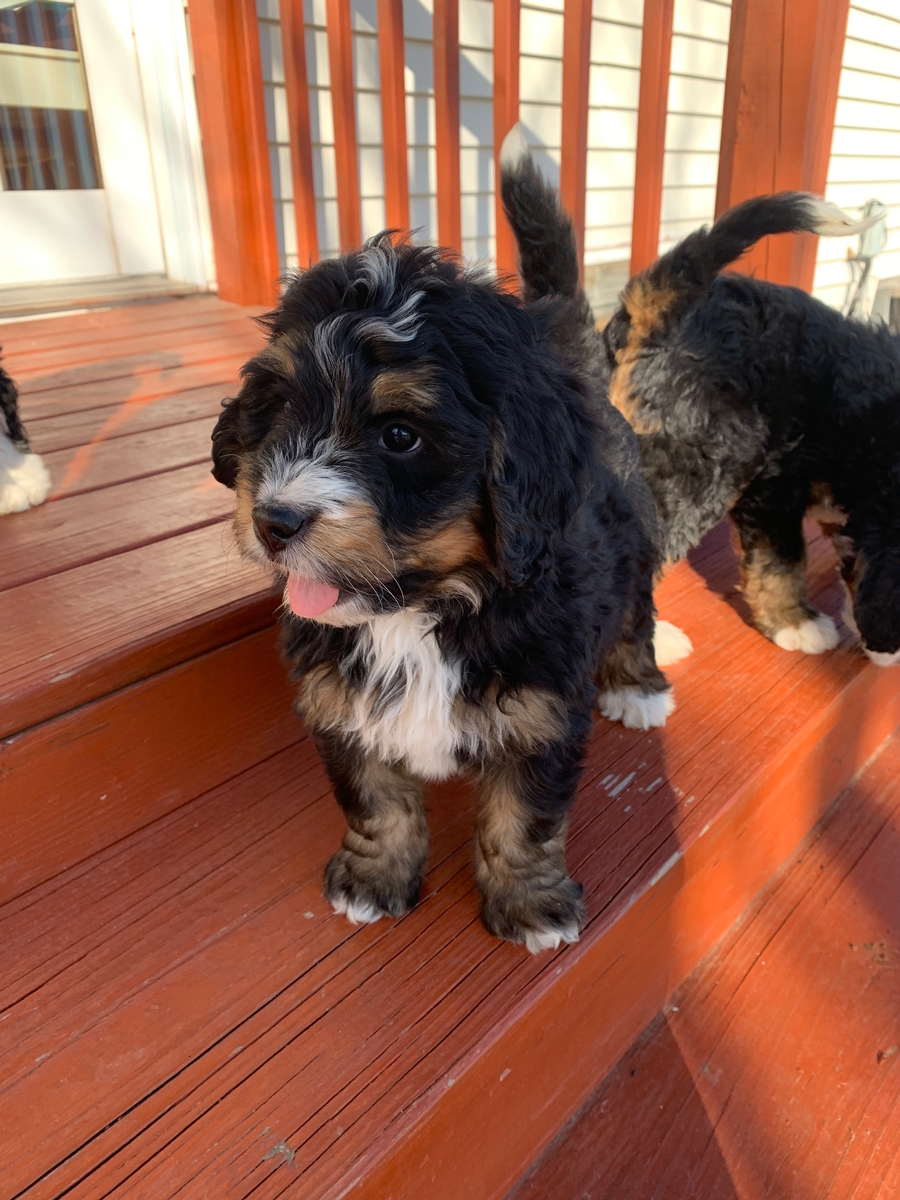 Camo is such an irresistibly cute little guy, and is sure to steal your heart! He is an F1 Medium Bernedoodle, and will have minimal shedding. He is weighing 7 lbs 1 oz currently and will grow to be around 35-55 lbs as a full sized adult. He will be ready to go to his new home by May 18th but we can hold for a week or two longer if needed with your schedule. He will come up to date on all vaccinations and has had all his regular dewormings. Camo has an introduction to crate/potty training so he has a head start for you! He will also be microchipped, and have a health/vet check and will be cleared before leaving. We welcome home visits or FaceTime calls if you would like to meet him.