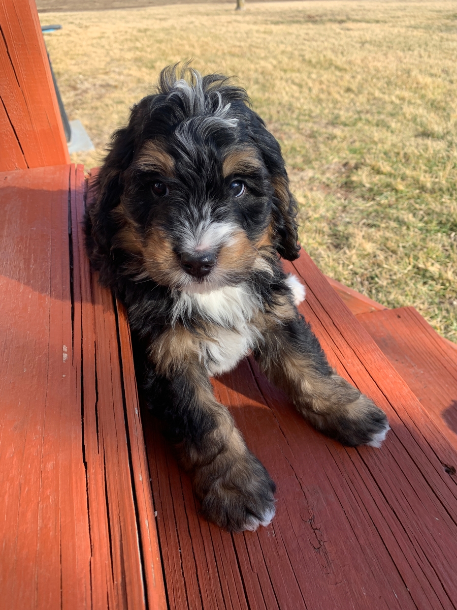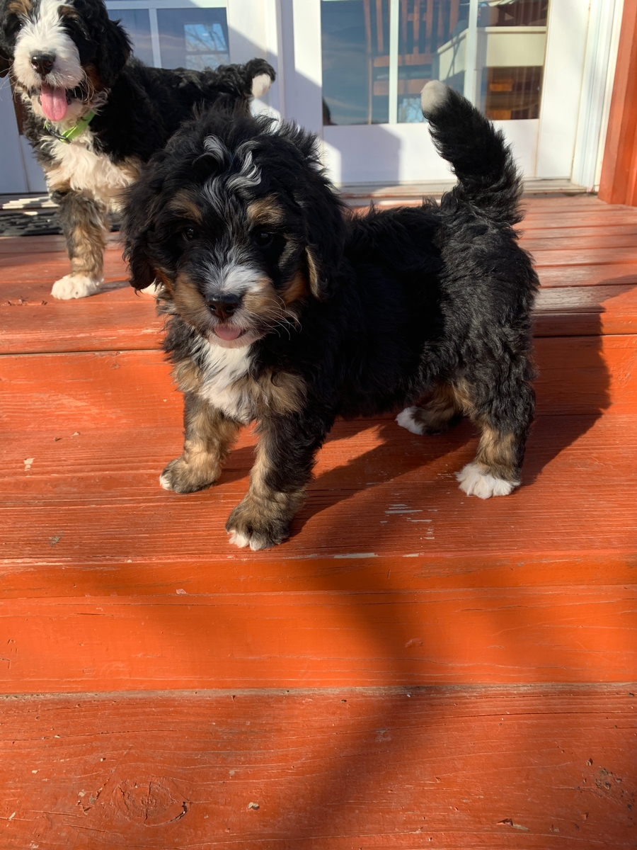 Ripley is a F1 Medium Bernedoodle. Minimal shedding and will grow to be around 40-70 lbs full size. He weighs 7 lbs 1 oz and will be ready by Feb 6th. He will come up to date on all vaccinations and dewormings, microchipped, and health/vet checked and cleared before leaving. Familes pick in the order of deposits received and selections will be made on the weekend of January 12-13th. Contact us today at 620-899-3173 to get your spot in line!