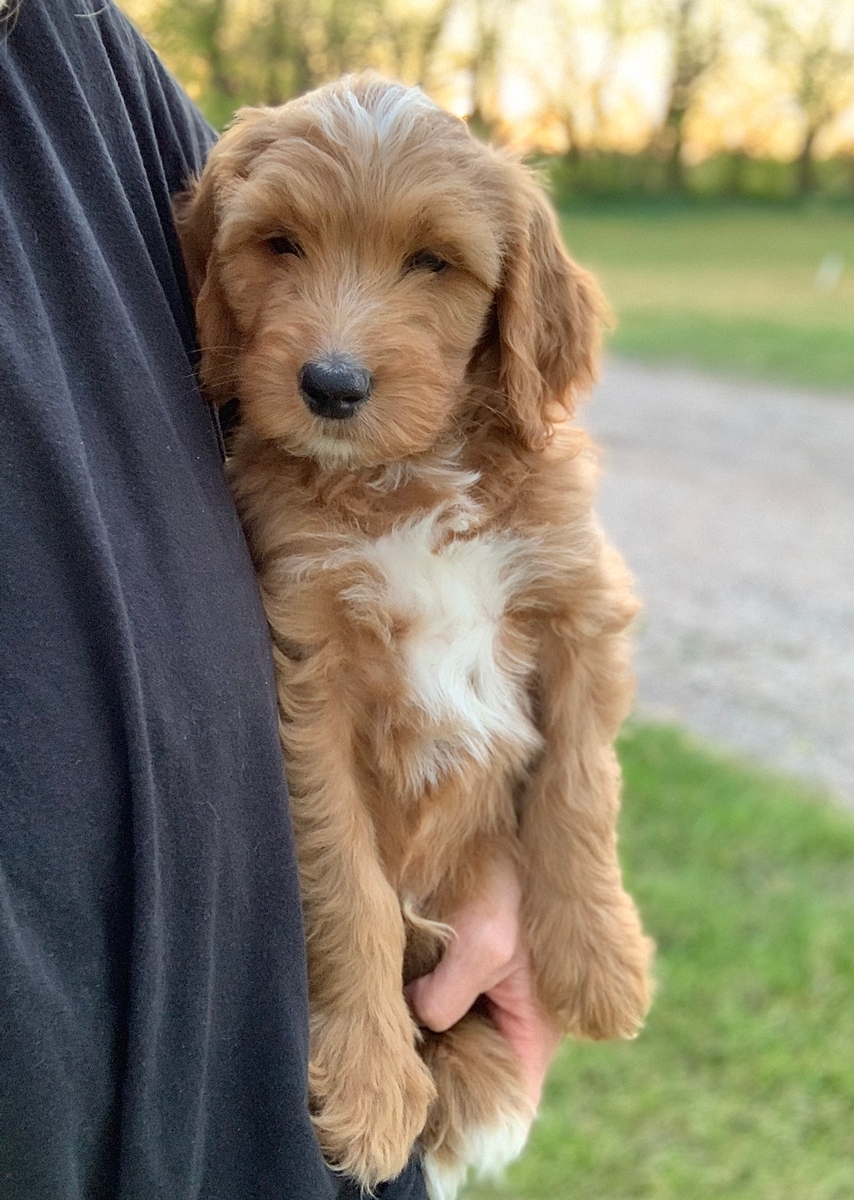 Max is a F1b medium golden doodle. He is non shedding and will grow to be 30-55 Ibs full sized. He adores his siblings and has the cutest face! His favorite things are running outside and being held in our lap. Max will be ready to go to his new home by Nov 11th. He is currently weighing 4 Ibs 9 oz.