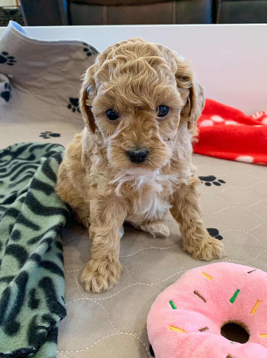 Cooper is a spunky little boy full of love and life! He loves to chase his siblings but then also likes to snuggle up and charm us all. He is a beautiful intense red teddy bear micro mini Goldendoodle. He is non shedding and will grow to be around 12-18 lbs full size. He currently weighs 2.07 lbs. He will come up to date on all vaccinationsu and dewormings and will be cleared by our vet before leaving. He also comes with a puppy starter pack and will have a folder with all his records in it. He will be ready by May 29th.