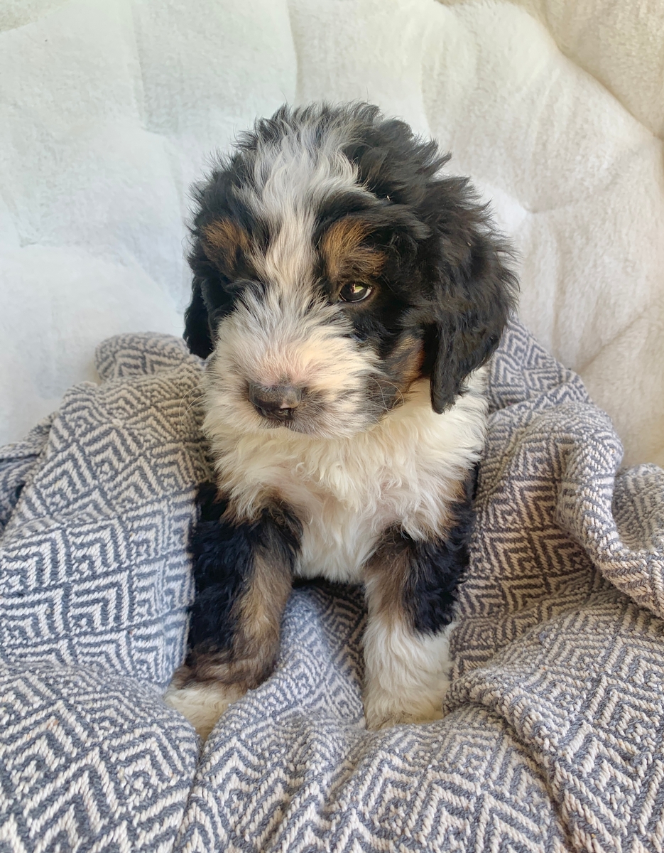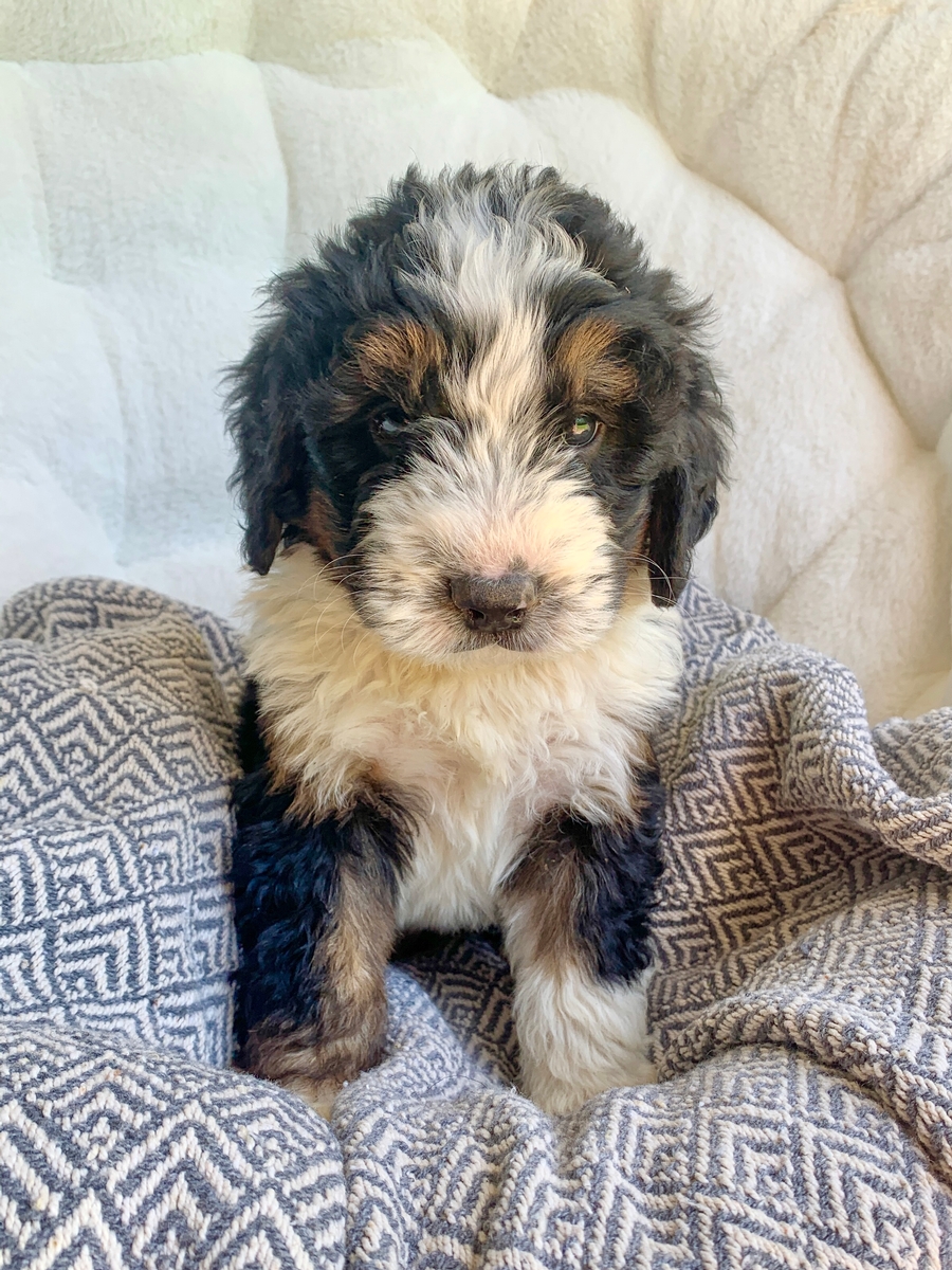 Camo is such an irresistibly cute little guy, and is sure to steal your heart! He is an F1 Medium Bernedoodle, and will have minimal shedding. He is weighing 7 lbs 1 oz currently and will grow to be around 35-55 lbs as a full sized adult. He will be ready to go to his new home by May 18th but we can hold for a week or two longer if needed with your schedule. He will come up to date on all vaccinations and has had all his regular dewormings. Camo has an introduction to crate/potty training so he has a head start for you! He will also be microchipped, and have a health/vet check and will be cleared before leaving. We welcome home visits or FaceTime calls if you would like to meet him.
