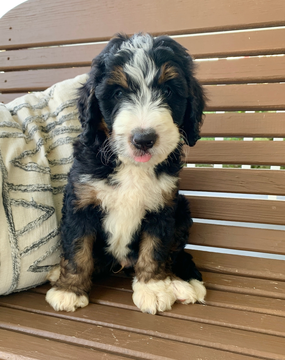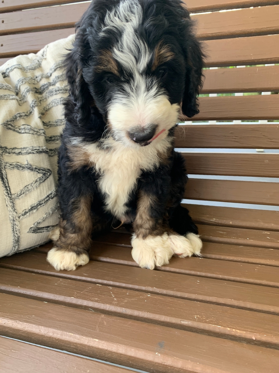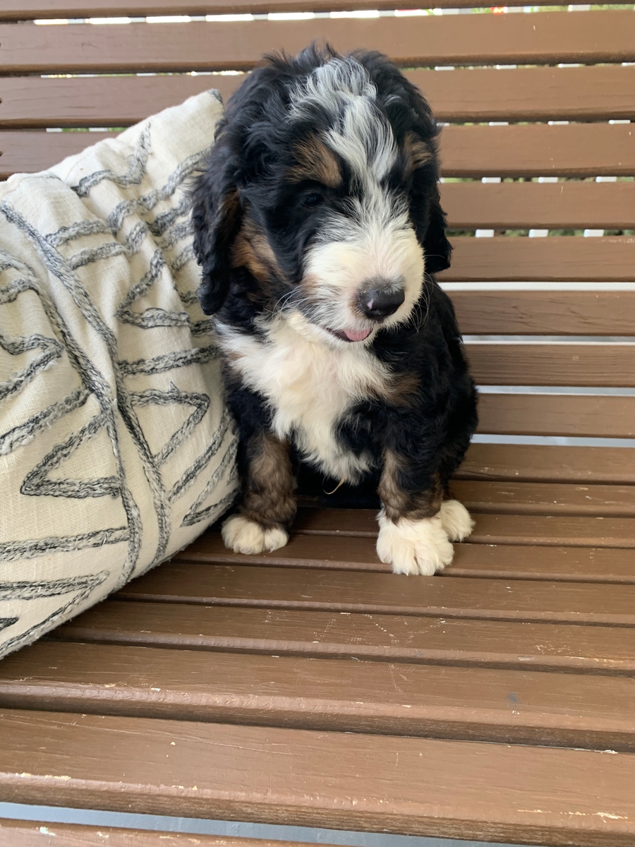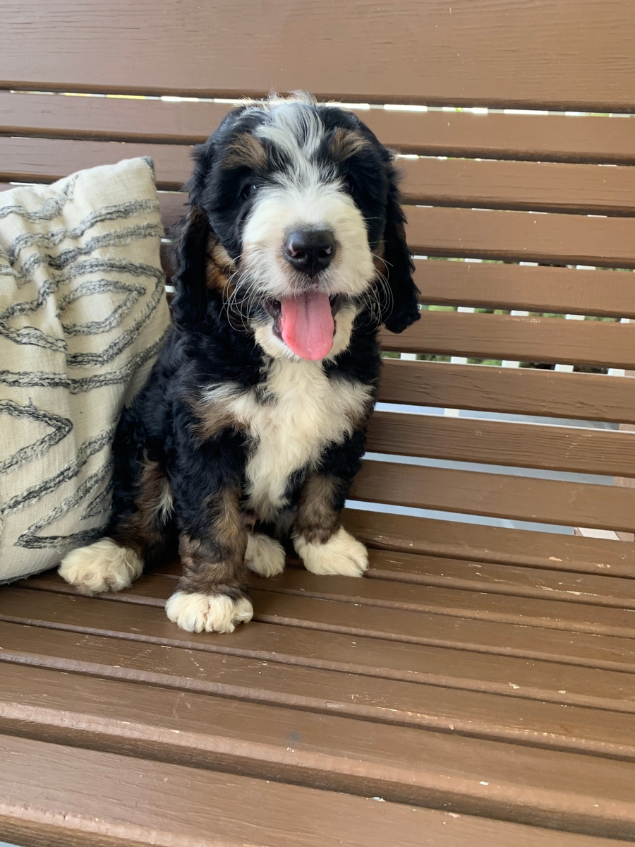 F1 medium Bernedoodle. Minimal shedding and will grow to be around 35-70 lbs full size. Ready by Oct 6th. Carter is an absolute joy to be around! He is full of life, and weighs 4.14 Ibs
