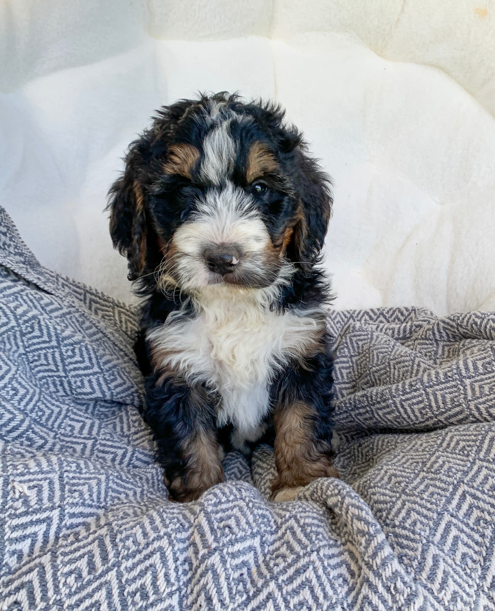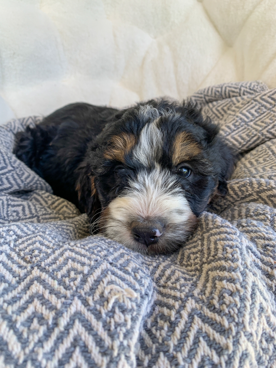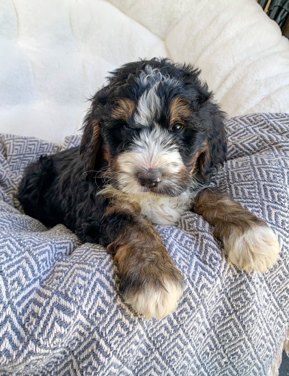 Camo is such an irresistibly cute little guy, and is sure to steal your heart! He is an F1 Medium Bernedoodle, and will have minimal shedding. He is weighing 7 lbs 1 oz currently and will grow to be around 35-55 lbs as a full sized adult. He will be ready to go to his new home by May 18th but we can hold for a week or two longer if needed with your schedule. He will come up to date on all vaccinations and has had all his regular dewormings. Camo has an introduction to crate/potty training so he has a head start for you! He will also be microchipped, and have a health/vet check and will be cleared before leaving. We welcome home visits or FaceTime calls if you would like to meet him.