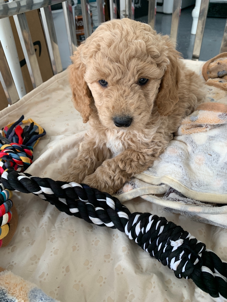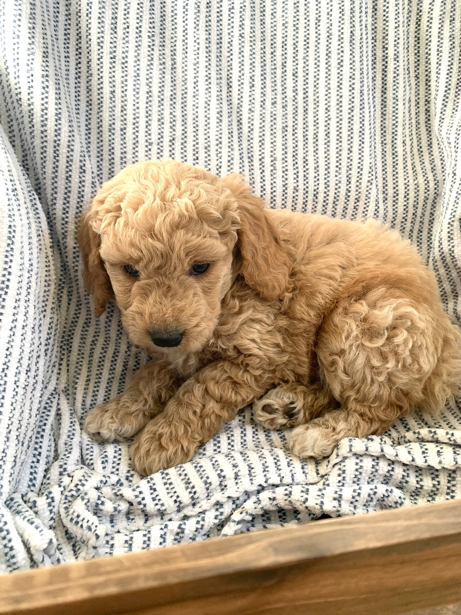 Dallas is a F1bb mini Goldendoodle and weighs 6 lbs 12 oz. He is so sweet and calmer and loves all the snuggles he can get! He is non shedding and will grow to be around 18-25 lbs full size. He is up to date on all vaccinations and dewormings, microchipped, and is health checked and cleared by our vet. He is also lovingly socialized by our family and has a head start on potty training! He will be 8 weeks old and ready to go by March 1st.