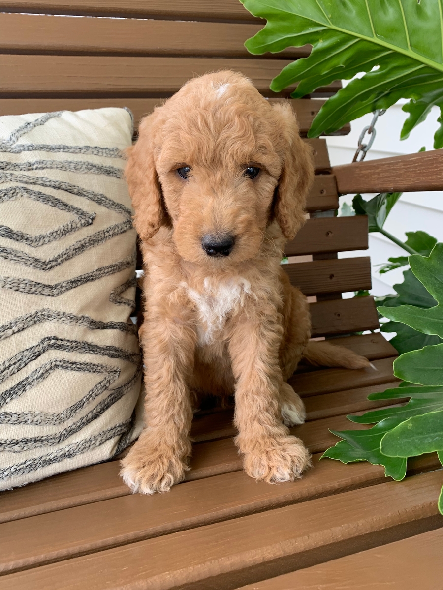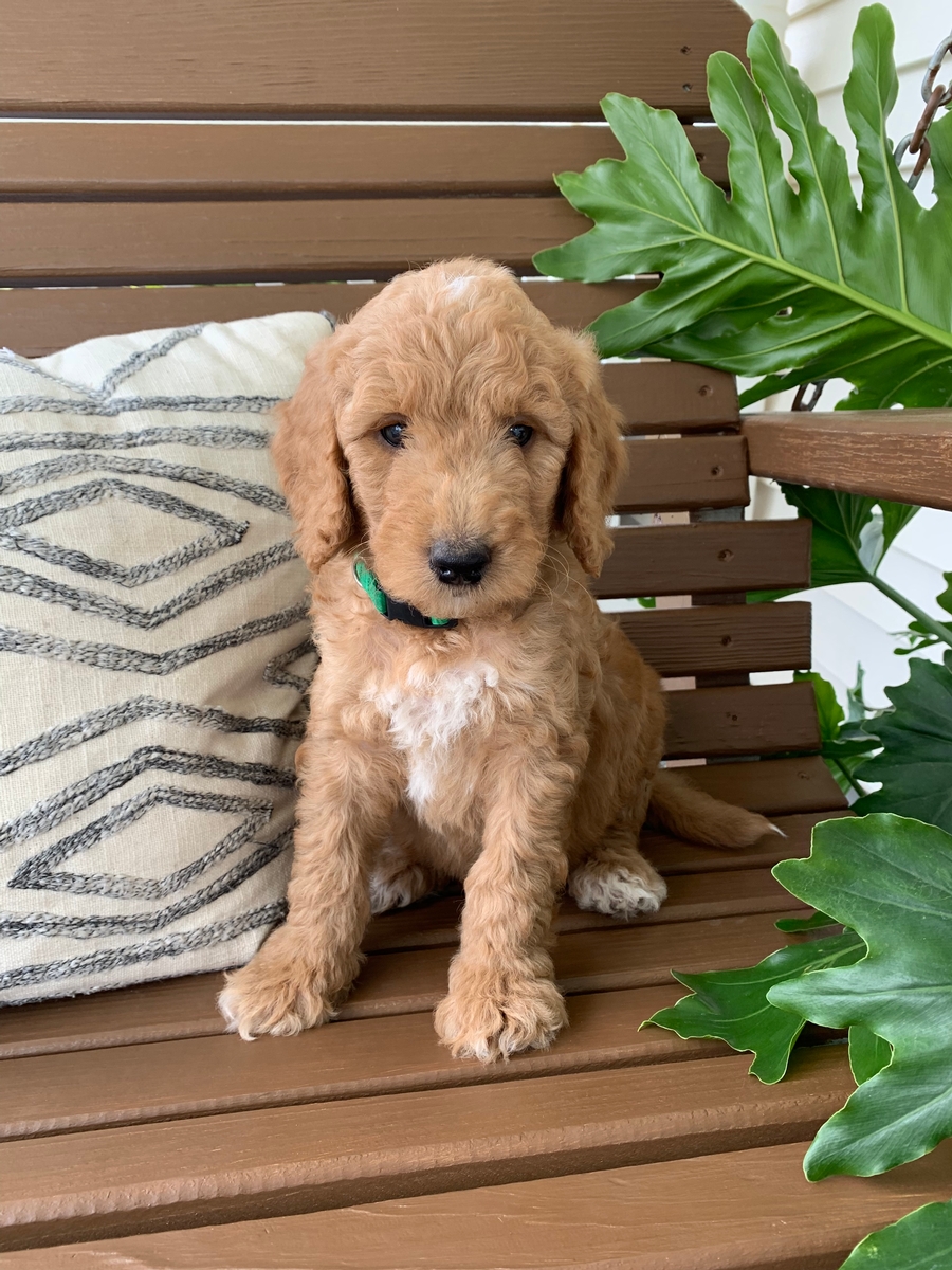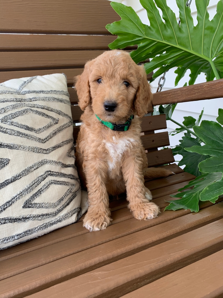 Jace is such an affectionate heart stealer! He has so much love to give and is sure to brighten your days! Such a big snuggler too. He is an F1b medium Goldendoodle. Ready by May 19th. Hypoallergenic, non shedding and will grow to be around 30-55 lbs full size. Puppy starter pack included.
