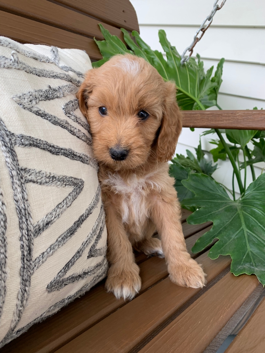 Mabel is a F1b medium golden doodle. She is non shedding and will be to 30-50 Ibs full sized. She is such a sweet girl has a beautiful red coat! Her favorite things are pulling her pink blankie around and getting lots of love from all of us! Mabel will be ready for her new home by Nov 11. She is currently weighing 4 Ibs 13 oz.