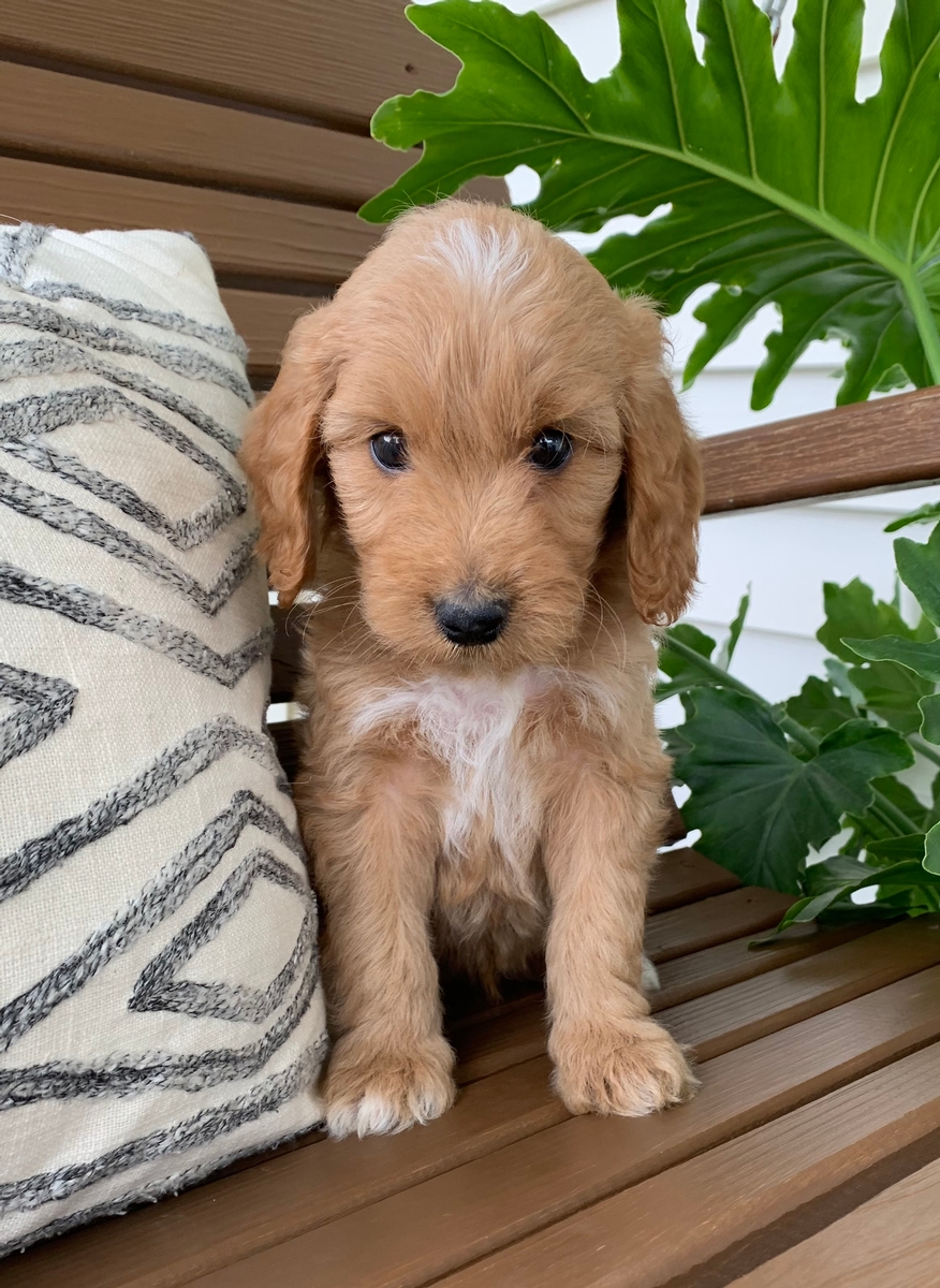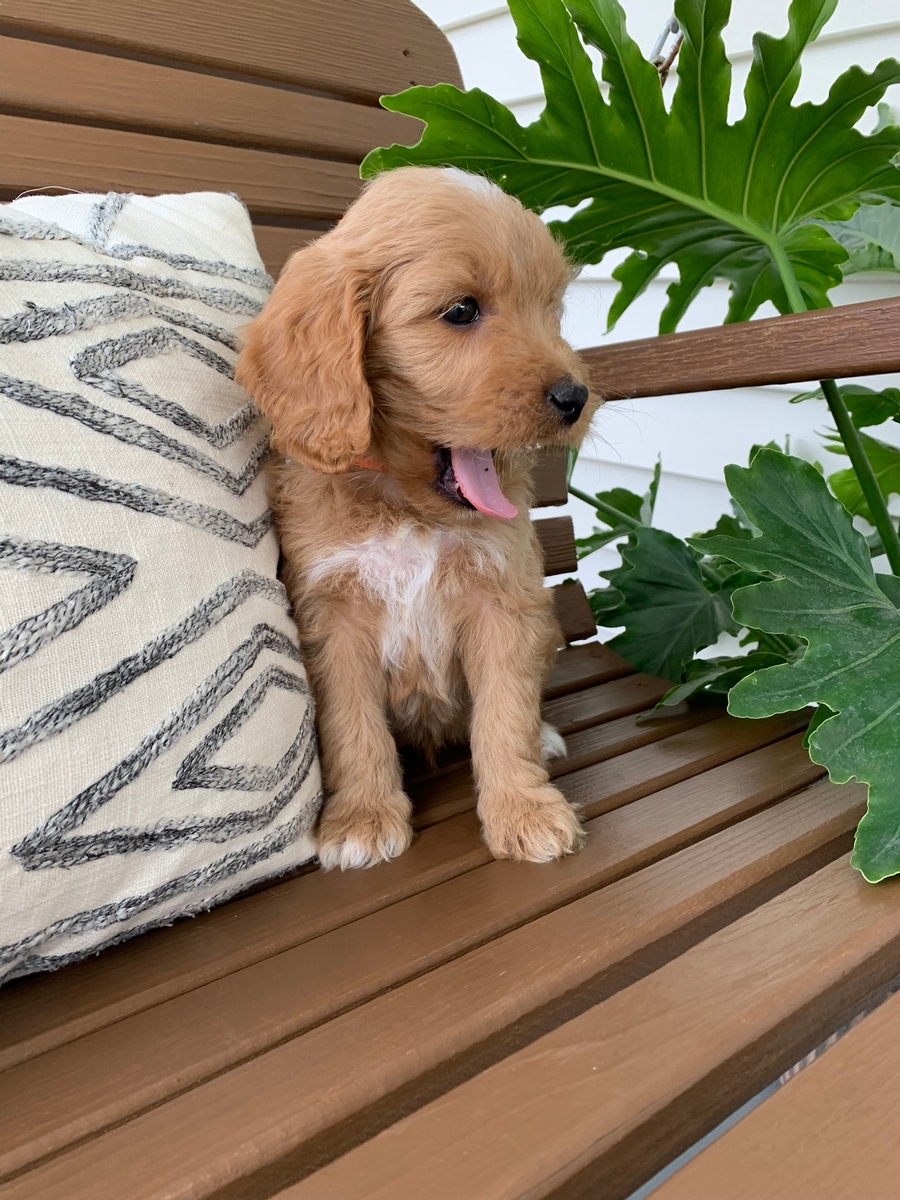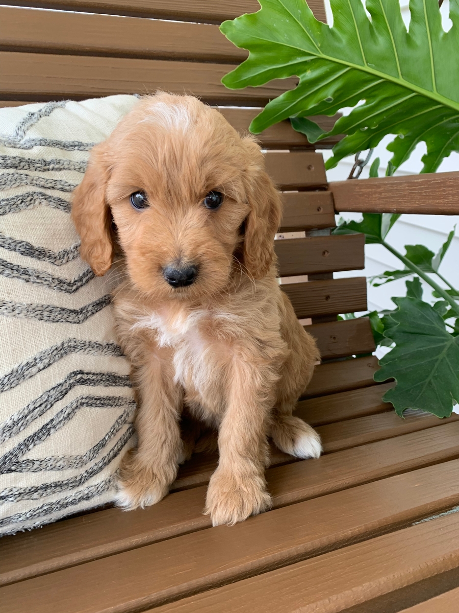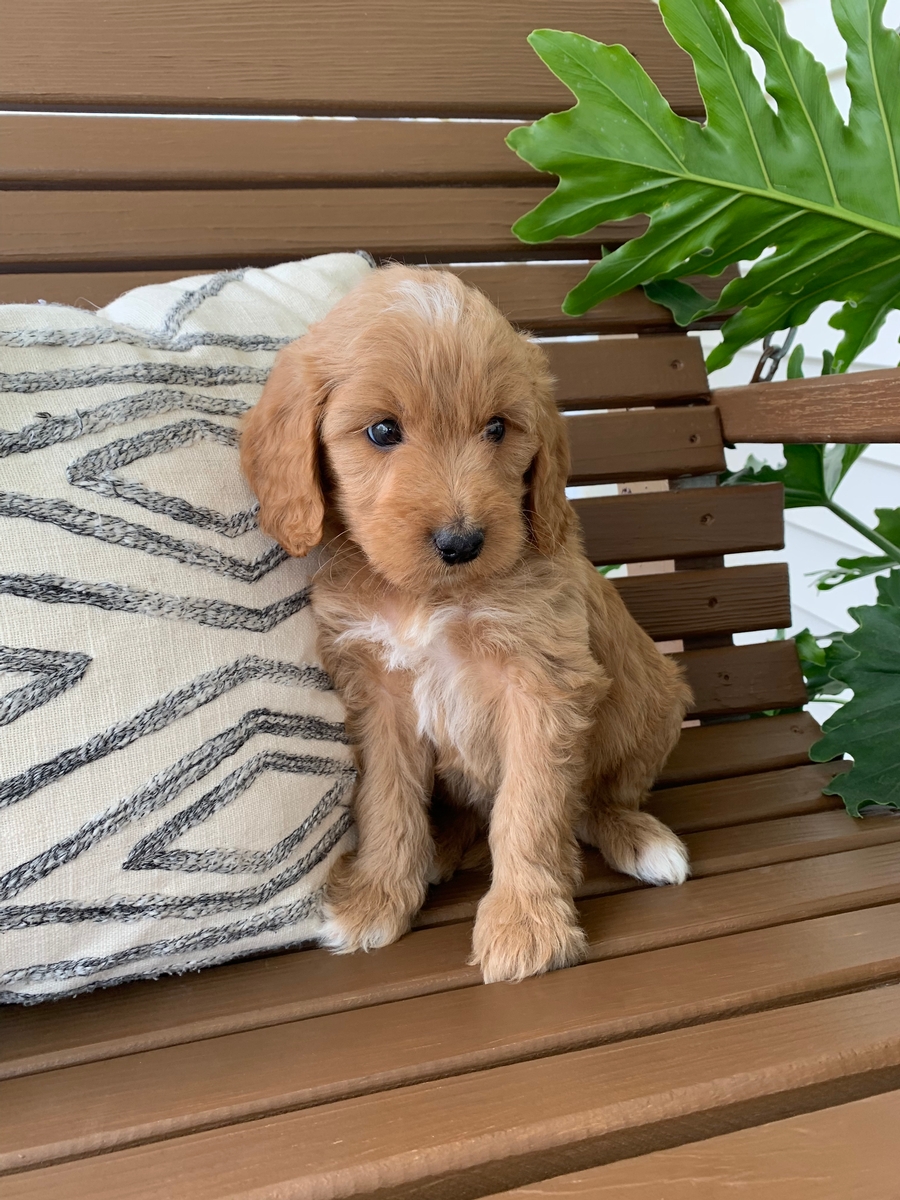Jace is such an affectionate heart stealer! He has so much love to give and is sure to brighten your days! He is such a big snuggler too. He is an F1b medium Goldendoodle. Ready by May 19th. Hypoallergenic, non shedding and will grow to be around 30-55 lbs full size. Puppy starter pack included.