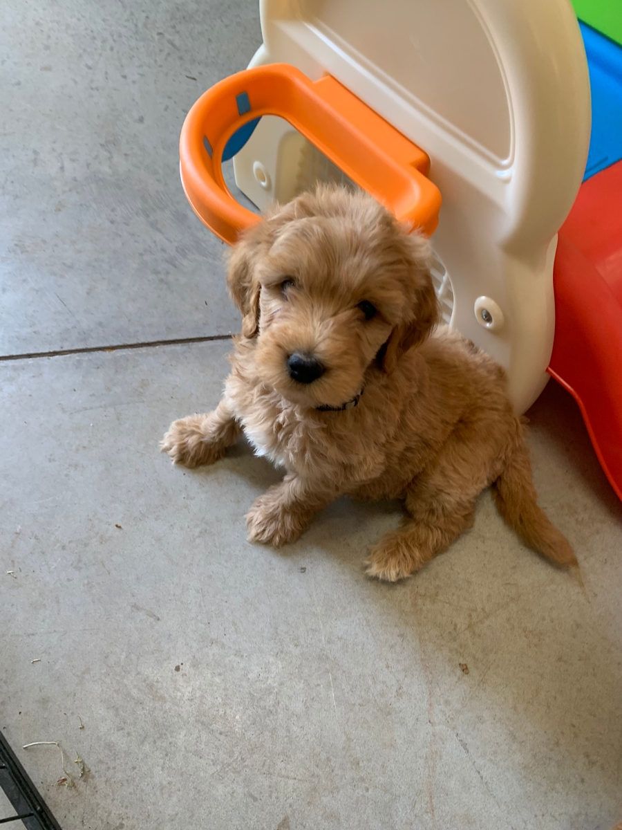 Milo is a F1b medium golden doodle. He is non shedding and will be to 30-55 lbs full sized. He is so much fun! He loves all the snuggles and loves to bounce around and play with us. His favorite things are his blue star squeaky toy and belly rubs. Milo is ready for his new home by Nov 11th. He is the smallest of the litter, currently weighing 3 Ibs 8oz.