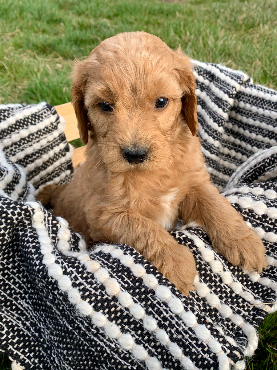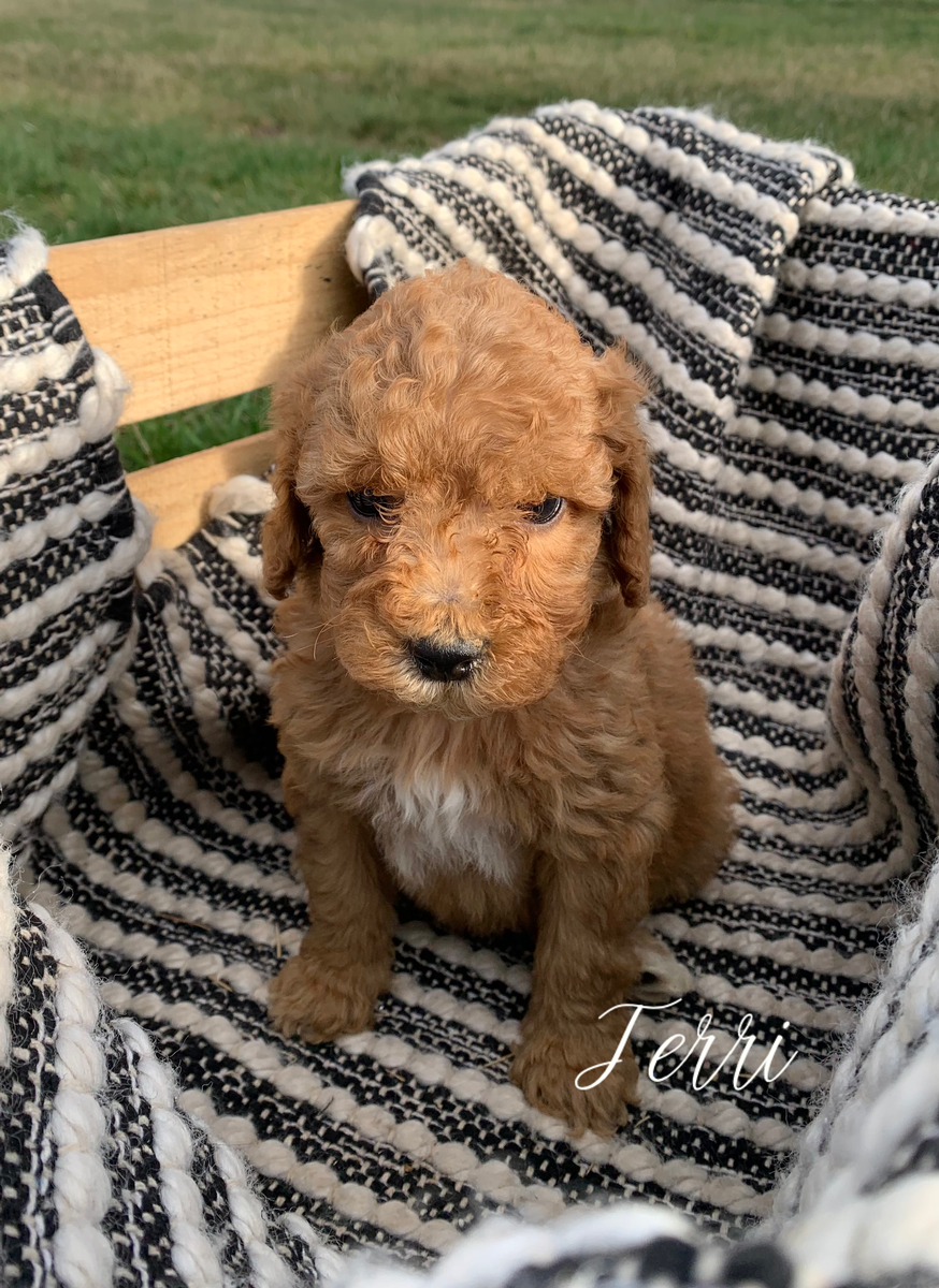Timmy is such a sweet and loving boy! He is a f1b medium Goldendoodle and is 8 weeks old, ready to go any day! He is non shedding and will get lots of loose curls and waves. He is calmer and loves all the snuggles he can get. He is sure to melt your heart and will bring so much joy to your home!
