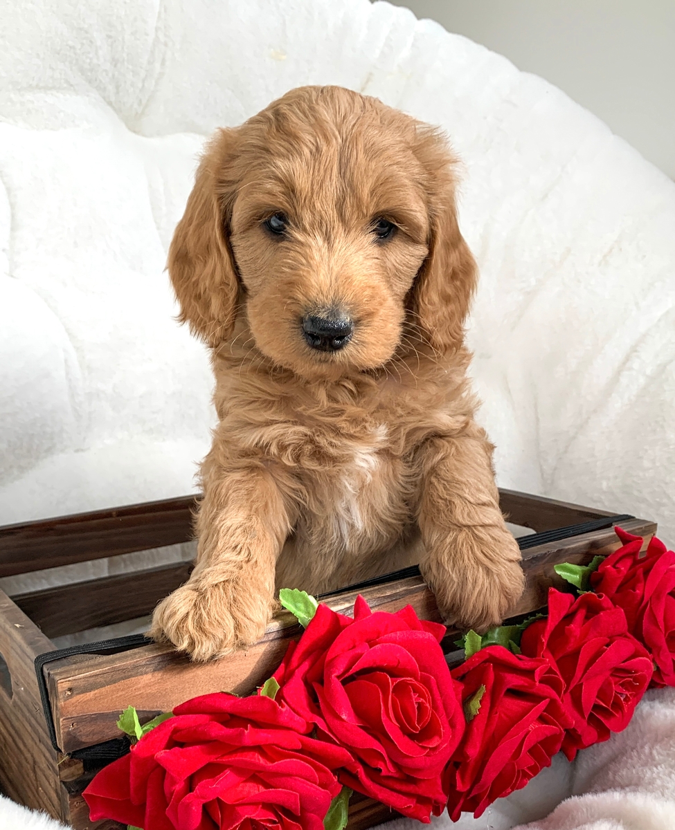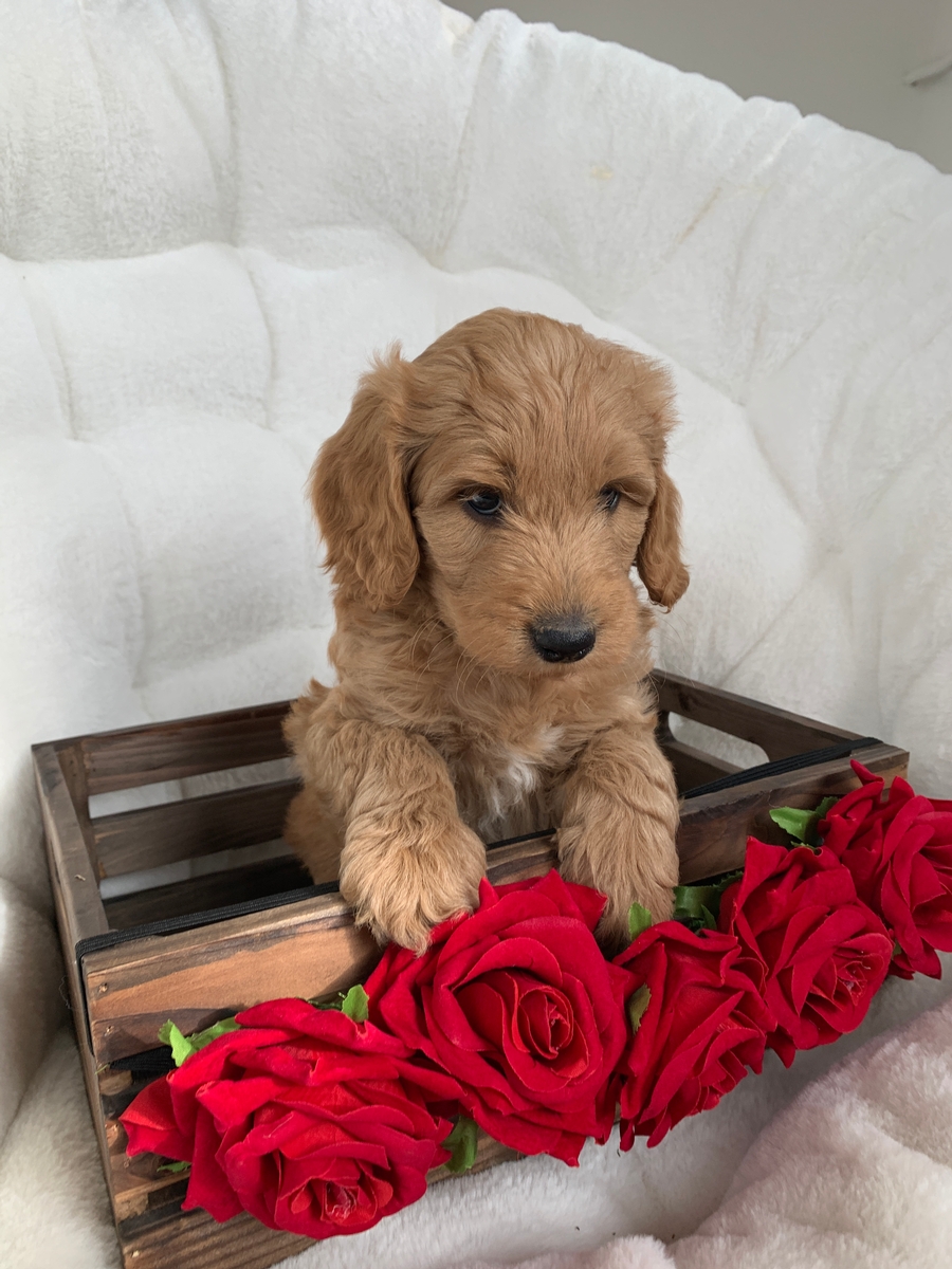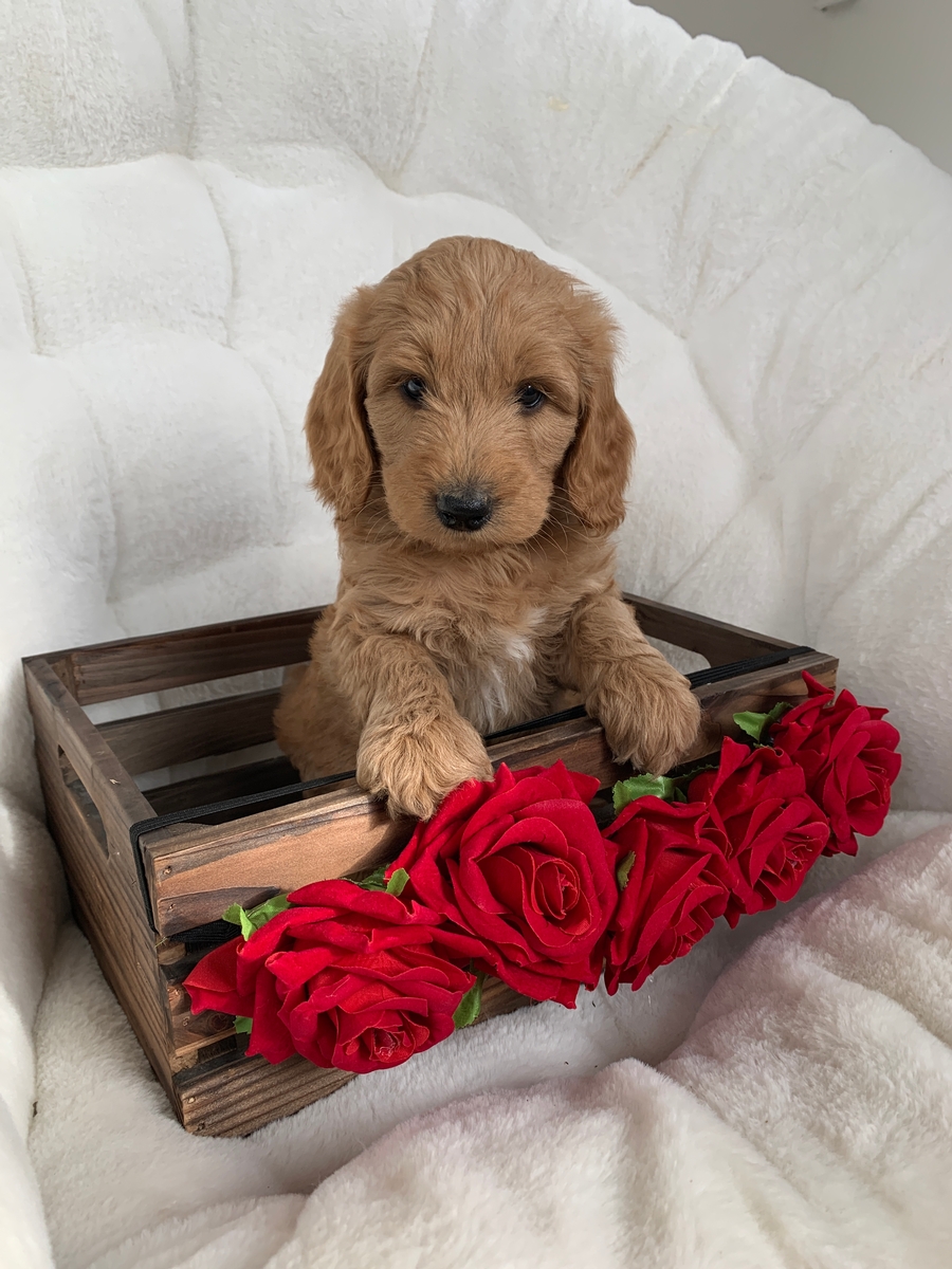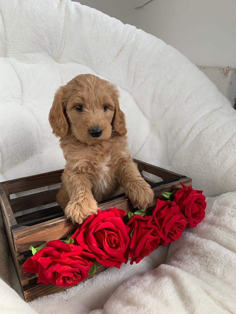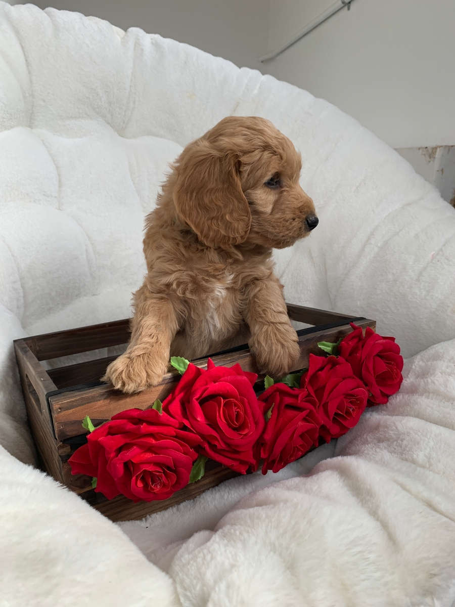Puddles is a F1b medium Goldendoodle. He weighs 2 lbs 12 oz. He will be non shedding and will grow to be around 30-55 lbs full size. He will come up to date on all vaccinations and dewormings, will be microchipped, and will be health checked and cleared by our vet before leaving. He will also be lovingly socialized by our family and will have a head start on potty training. He will be 8 weeks old and ready to go by Feb 21st.